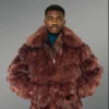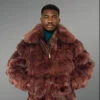 Mens Coffee Brown Fox Fur Bomber Jacket – Commands Attention with Chic Elegance