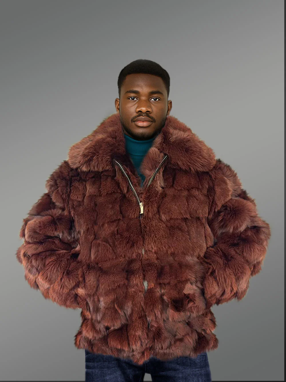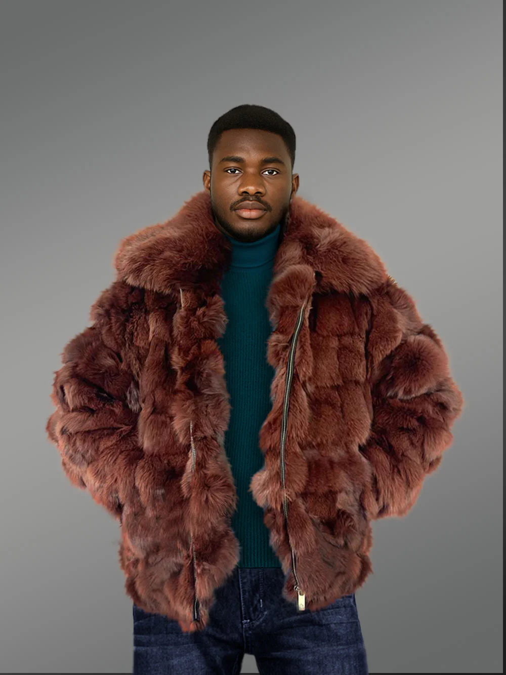This luxurymenscoffee brown fox fur bomber jacket exudes sophisticated masculine charm and wraps one in the comforting warmth of natural fur. It’s indeed a statement piece for modern gentlemen. Designers have handcrafted it from premium fox fur. Therefore, its aesthetics and functional features remain preserved for decades requiringminimum maintenance and care.It features a broad turndown-style collar as well as a front zipper for closure. The long sleeves offer complete coverage to the arms. Furthermore, it has elasticated cuffs and hemline for both practical and stylistic reasons.